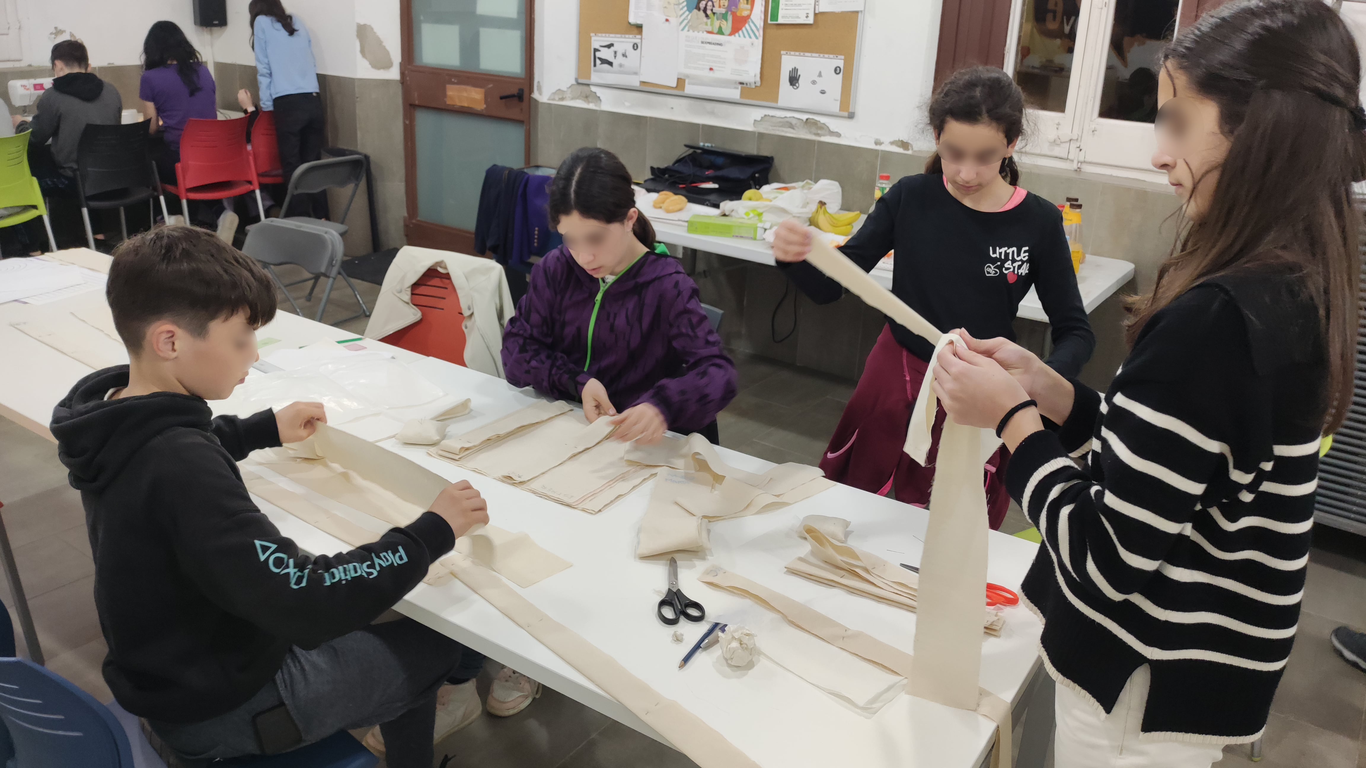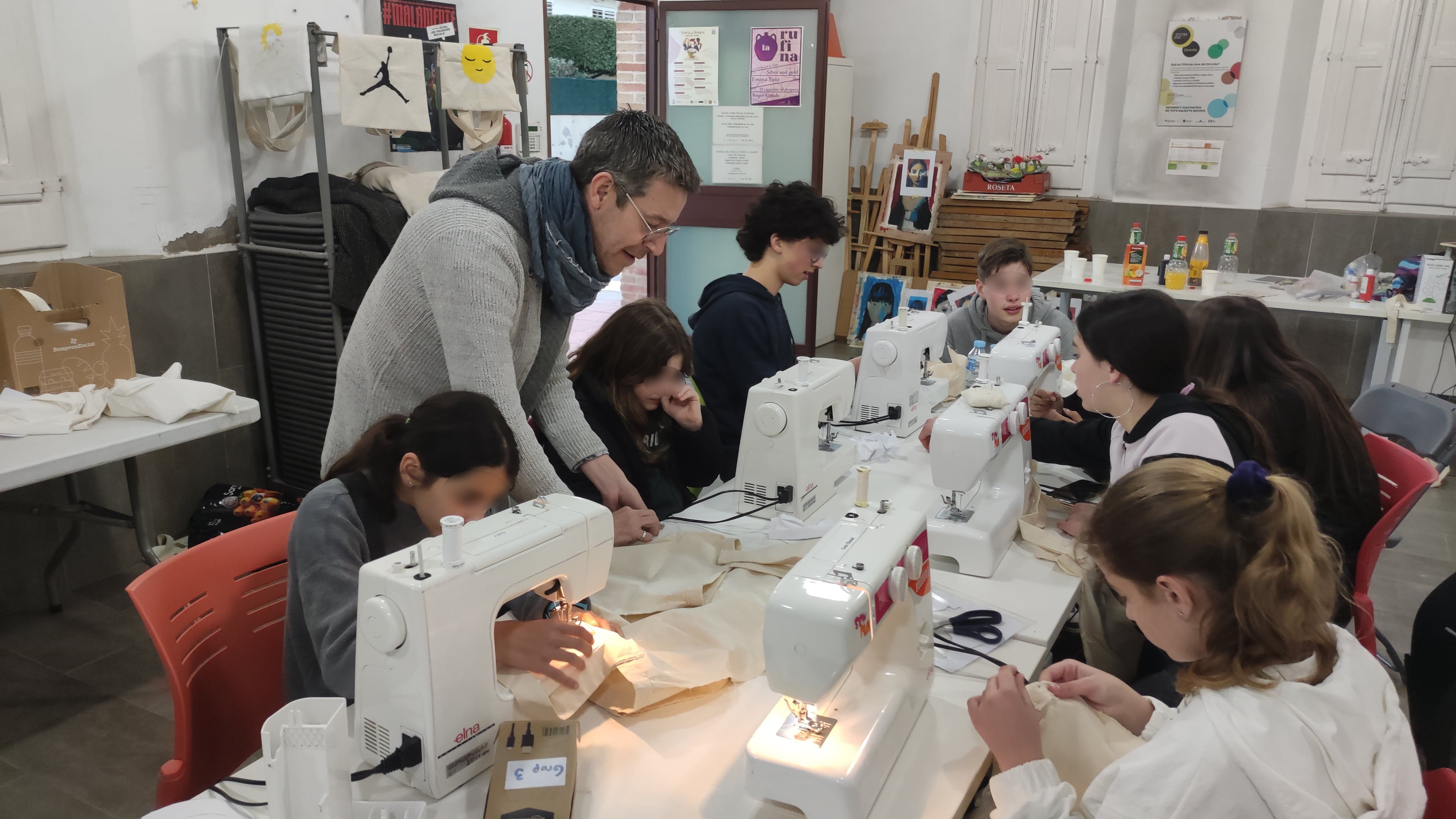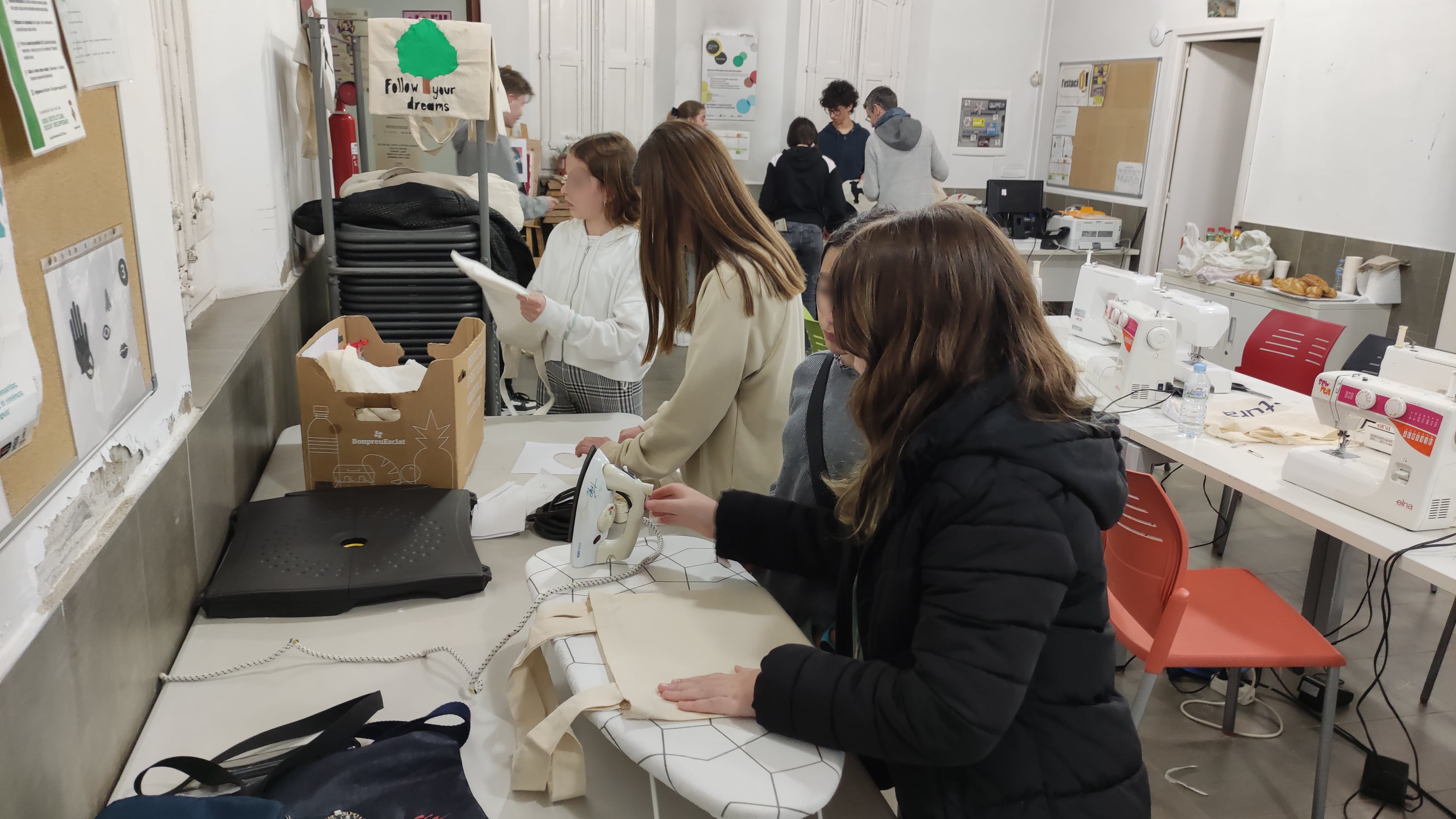 El primer dia van aprendre a fer el patró de la bossa, a tallar la roba i aprendre a fer funcionar una màquina de cosir.